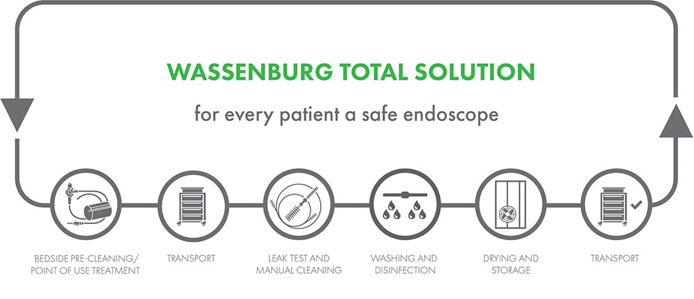 Wassenburg solutions are designed to deliver a safe and controlled treatment of flexible endoscopes. Our end-to-end total solution includes pre-cleaning, washing and disinfection, storage, transport and traceability.